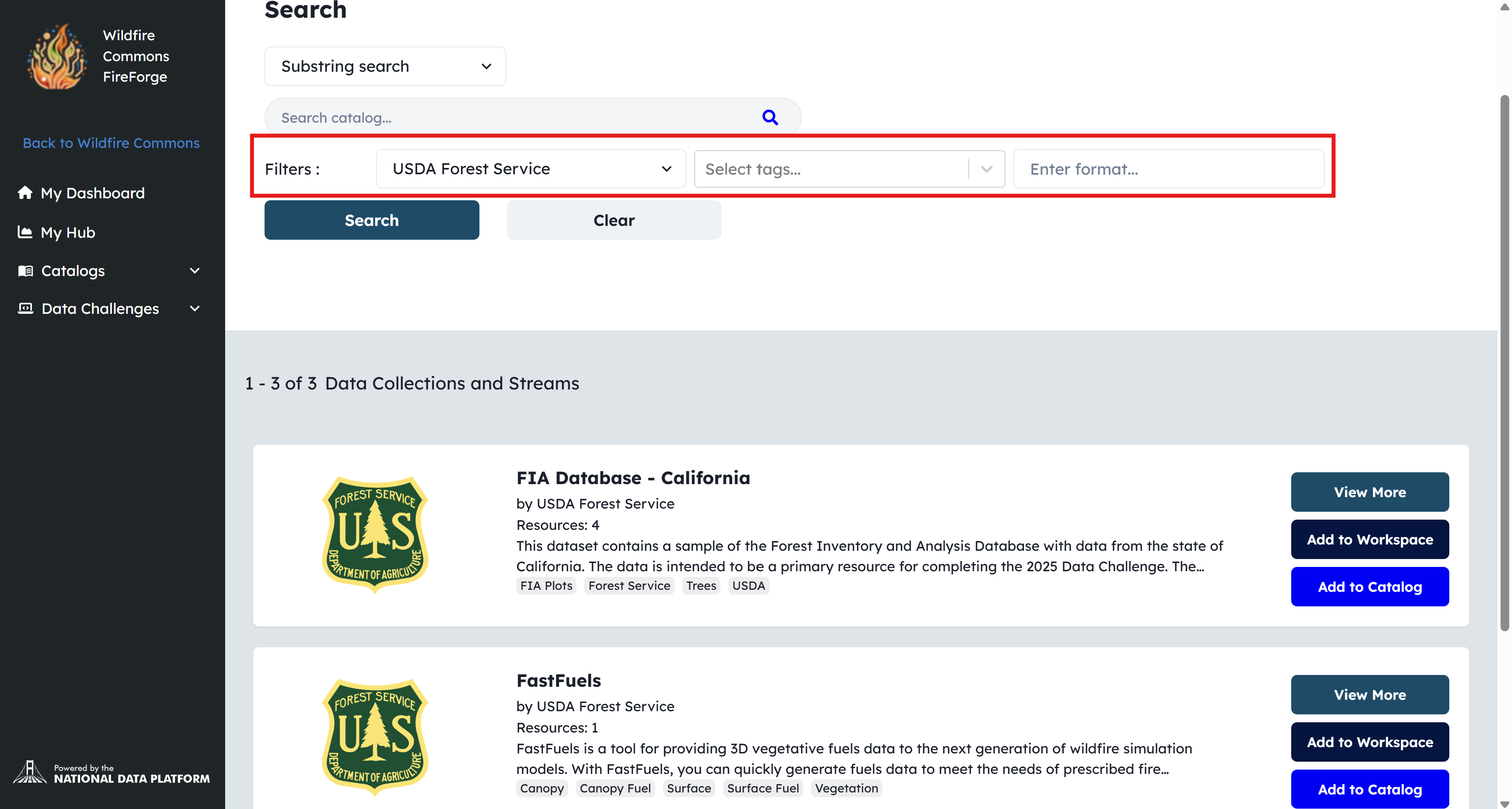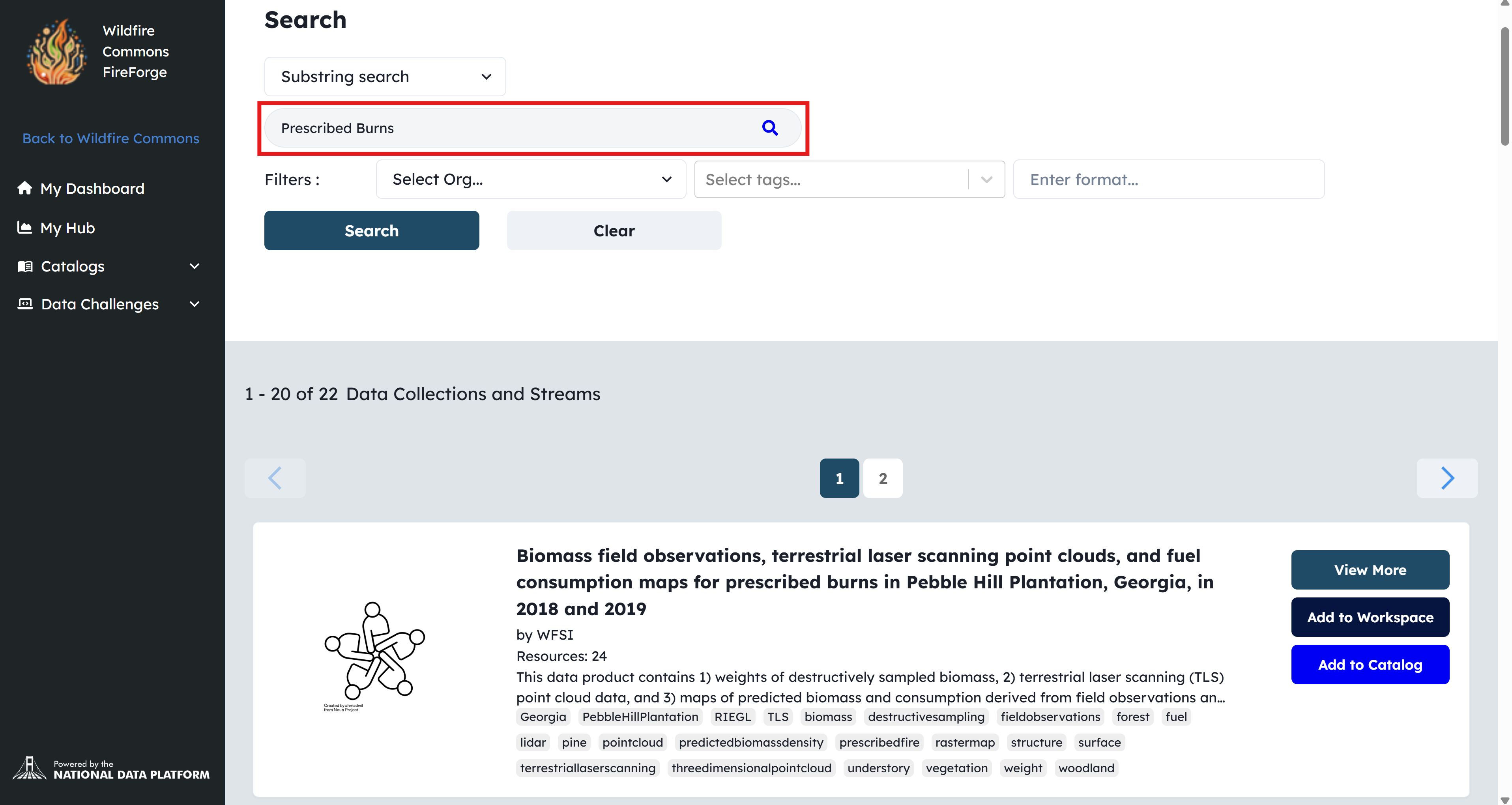 To streamline data discovery, Wildfire Commons integrates a search engine that enables users to locate datasets quickly and efficiently.